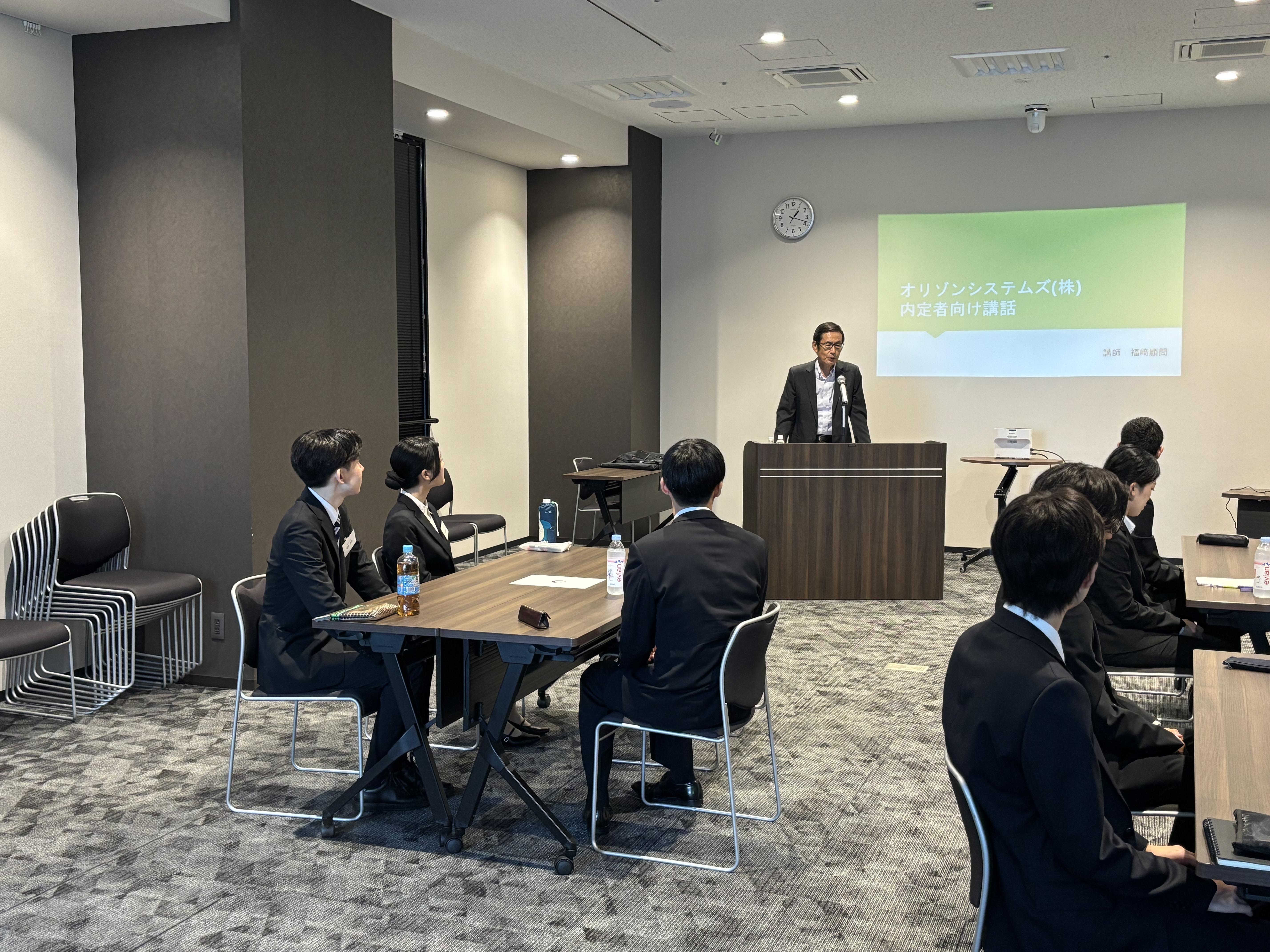 古瀬常務からは、「自らが選んだ道に自信を持ち、仲間とともに挑戦してほしい」とのお話がありました。また、社会におけるオリゾンシステムズの貢献性について伝えられ、その責任とやりがいを胸に働くことの大切さが語られました。来春に向けて大きな期待が寄せられ、内定者の皆さまも希望を胸に、社会人としての第一歩を踏み出す決意を新たにされたことと思います。
