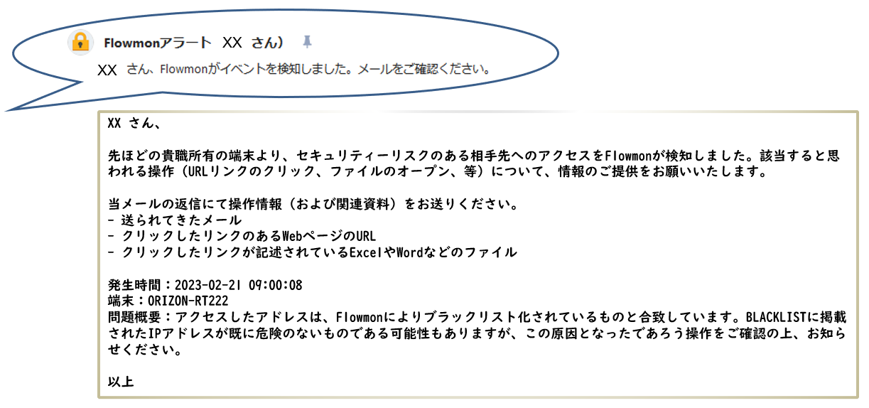 - 従来の管理者への通知と合わせ、実際のイベントの発生元(ユーザー)へメールにて対応依頼の行う