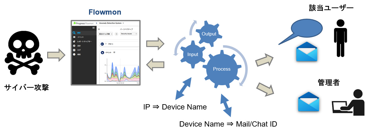 オリゾン社内で現在活用しているFlowmonを利用した仕組みが、個別のユースケースに適した典型的な例といえます。この仕組みでは、Flowmonが検知したイベントに応じて、該当するクライアントの所有者へ必要な対応を自動メールで案内する機能が提供されています。具体的には、Flowmonから得られたイベント情報(例えば、発信元IPなど)を利用して、そのユーザーの現在のメールアドレスを特定し、問題が発生してから迅速にメールやチャットで注意喚起を行うことで、オペレーションにおいて何が問題となったのかをユーザーが素早く認識できるようになっています。