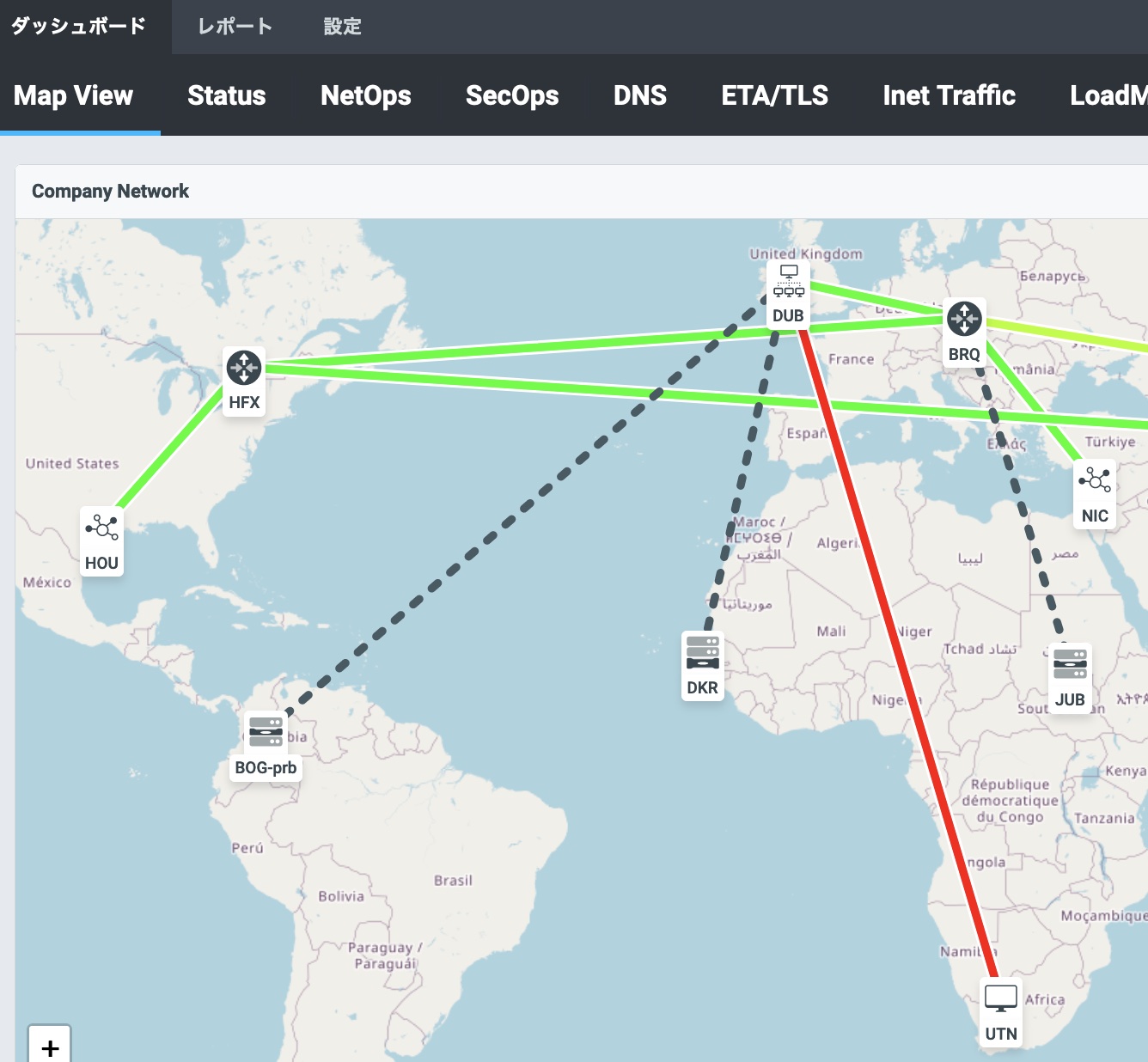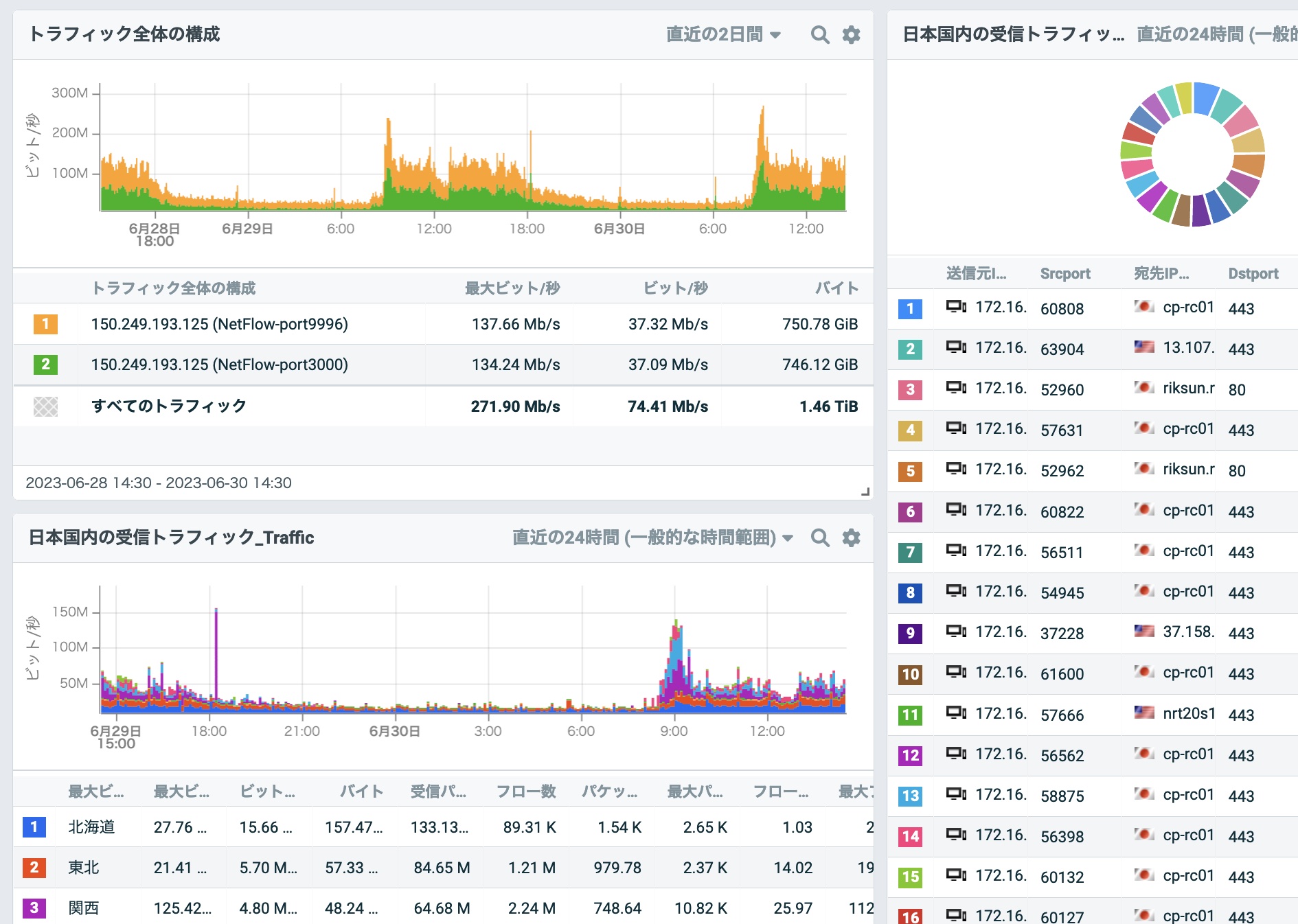 - 直感的なダッシュボードやレポートの提供と、可視化されたデータの直感的な表示による、ネットワークの状態やトレンドの把握、およびトラフィックパターンの分析機能
