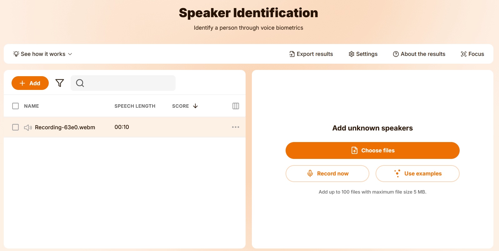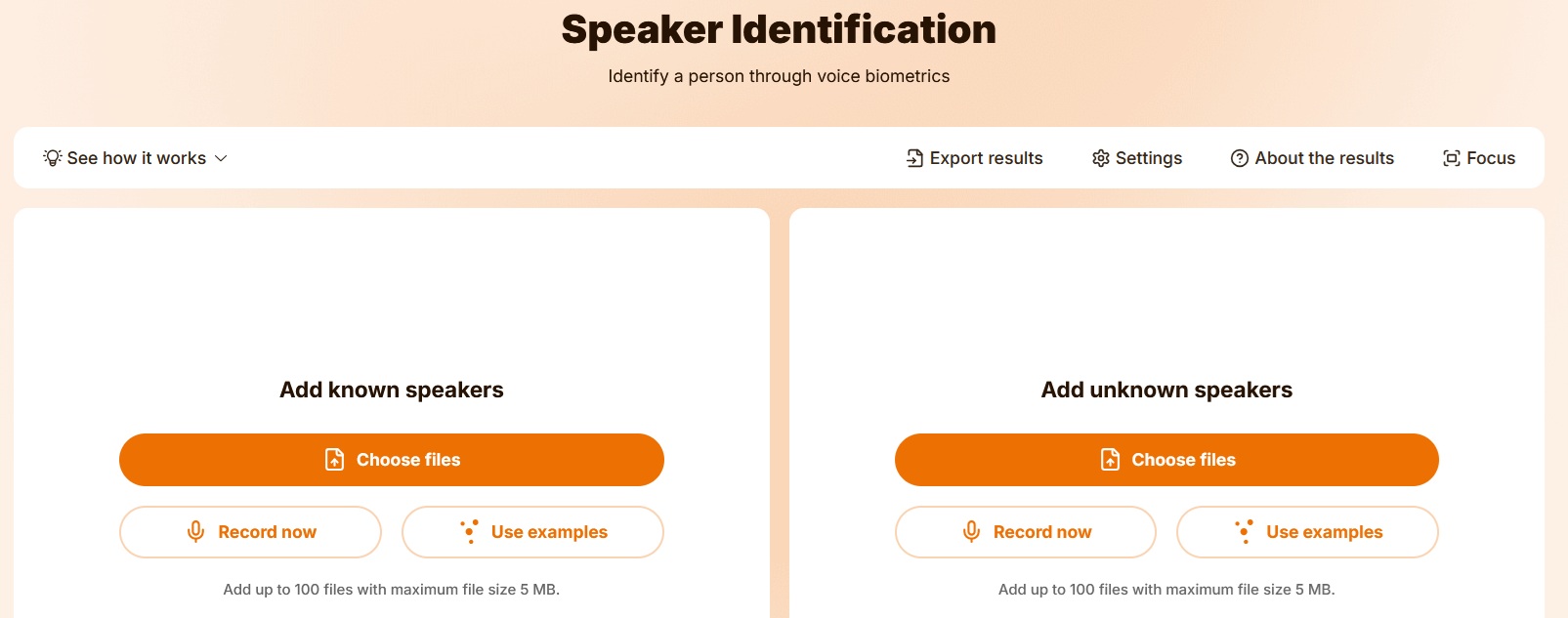※「Use examples」を選択し、事前に用意した音声ファイルや、Phonexia社の提供するサンプル音声ファイルを使用することも可能です。