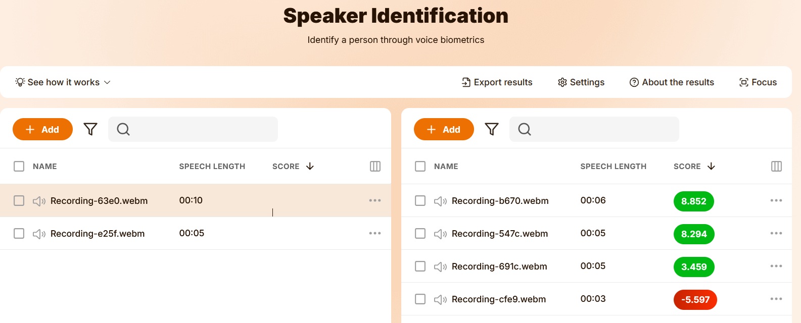 - 次に右の「Add unknown speakers」で、同様の手順で、比較対象の音声をレコーディングします。