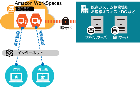 PC59は、インターネットにつながるPCからAWS上のVDIへ、また、AWS上のVDIから社内の資産へ接続を行うため、どこからでも社内にいるときと