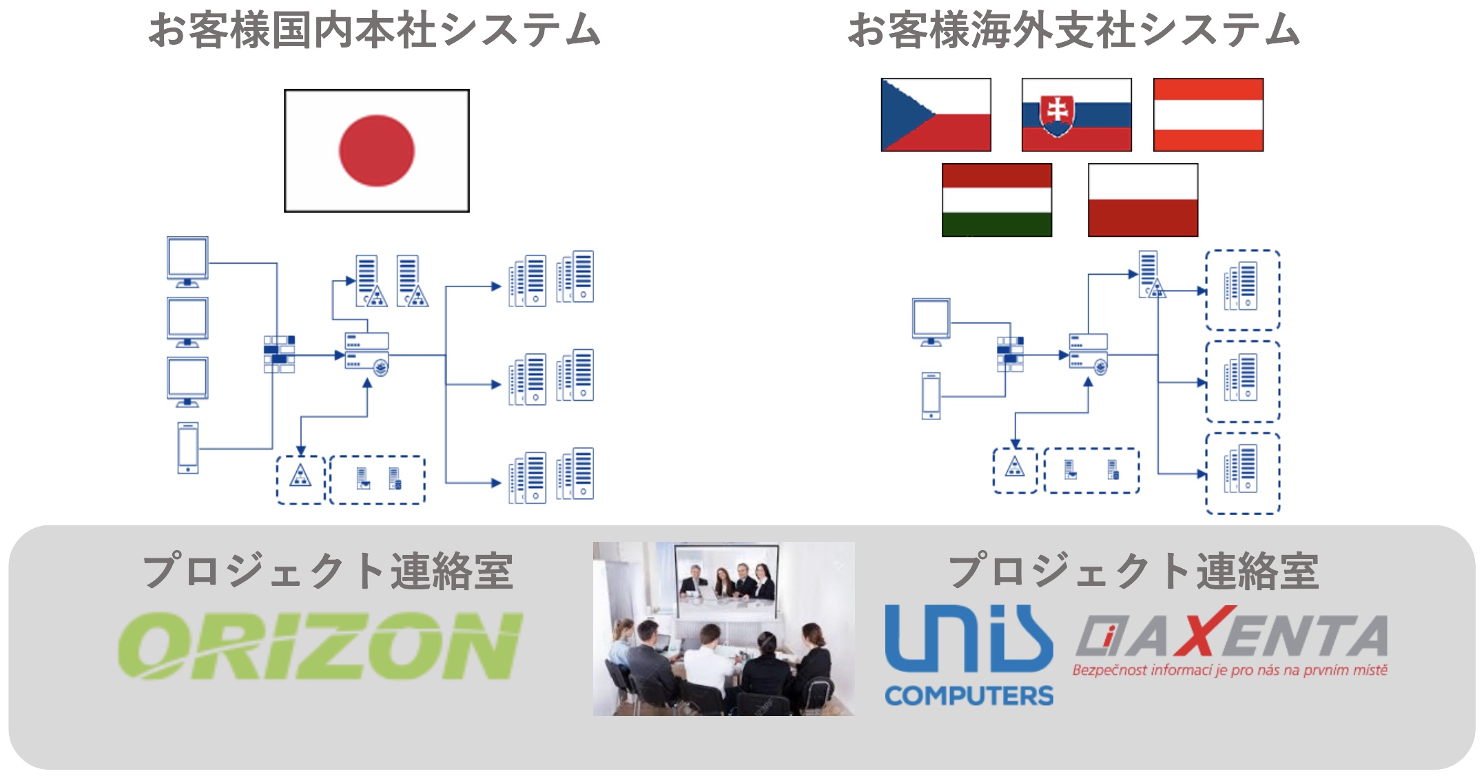 中央ヨーロッパ・チェコ共和国に拠点を置く UNIS Computers社および AXENTA社 と提携し、オリゾンシステムズは現地に展開するお客様のIT基盤のライフサイクル管理を、日本国内と合わせ横断的にご支援いたします。